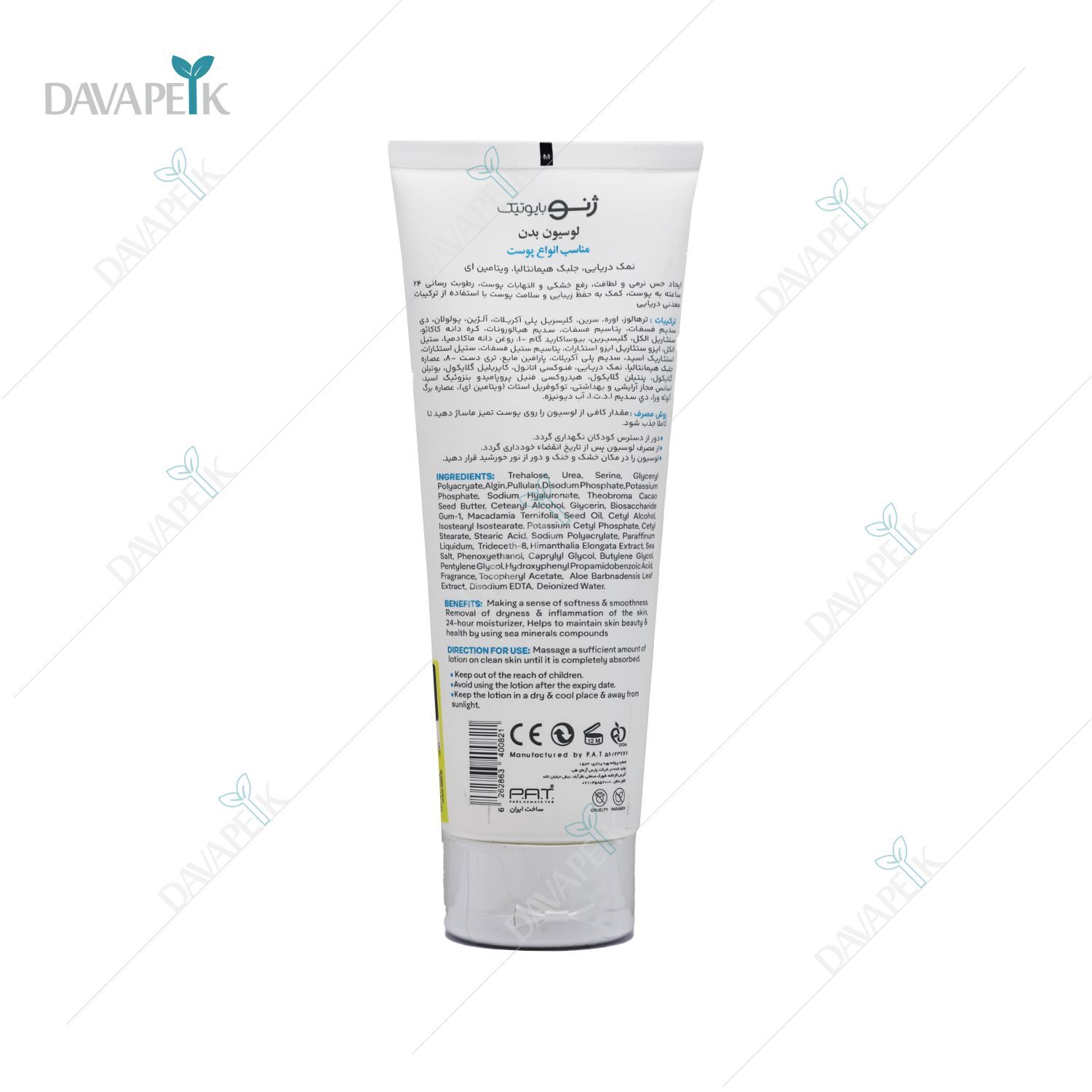 - لوسیون بدن ژنوبایوتیک دارای ویتامین E ، نمک دریایی و عصاره جلبک هیمانتالیا می باشد .