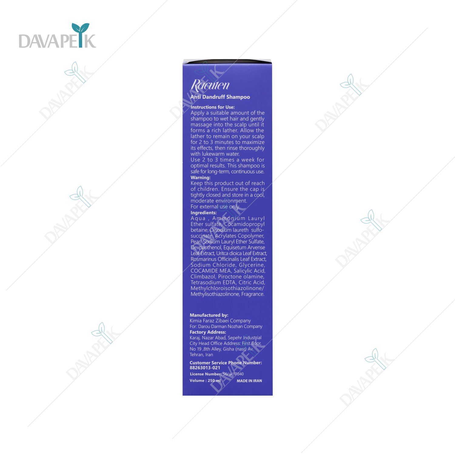 - Racuten Anti Dandruff Shampoo با خاصیت ضدقارچ از رشد قارچ های مولد شوره جلوگیری می کند.