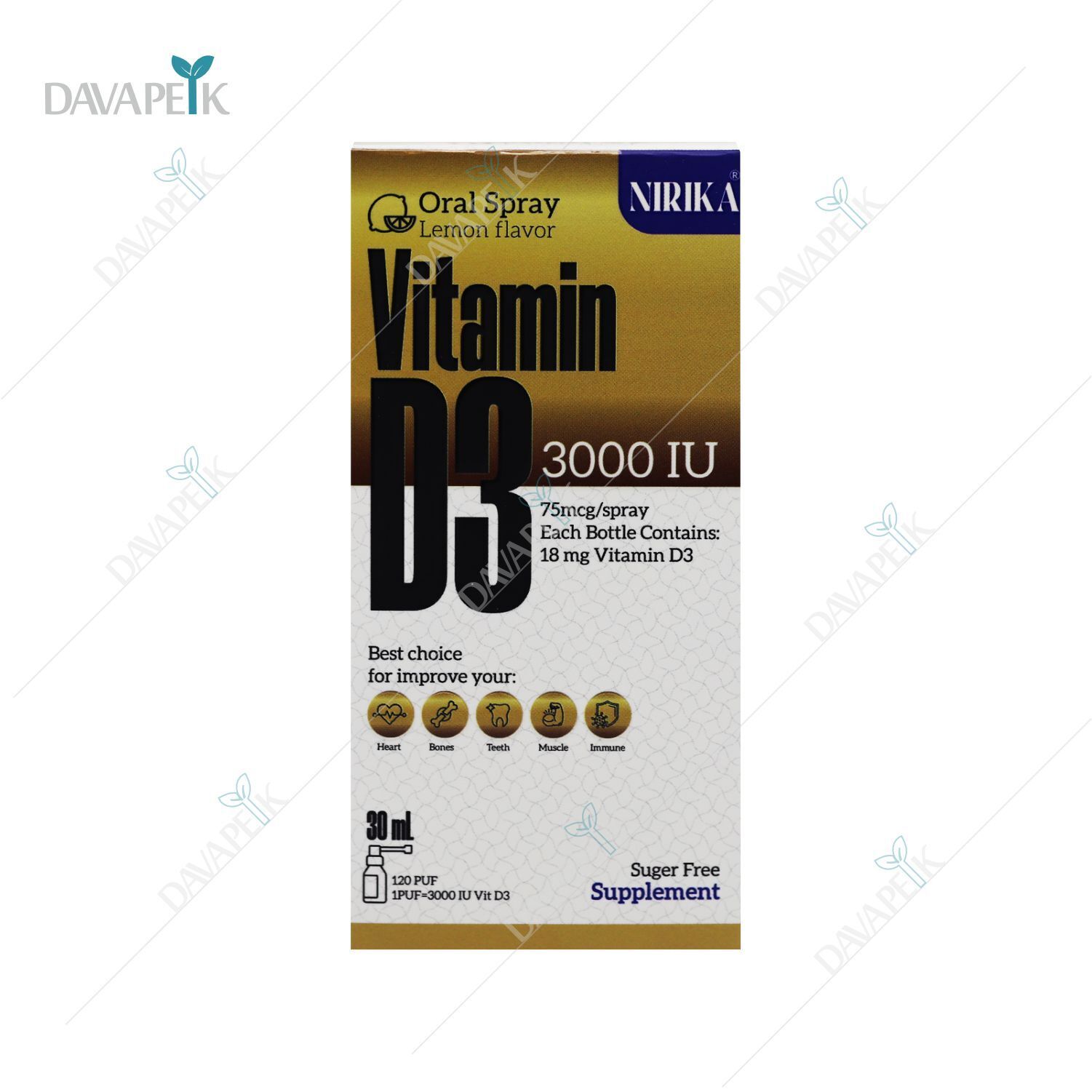 - Nirika Vitamin D3 3000IU Oral Spray با جذب سریع زیرزبانی، به تقویت استخوانها، سلامت دندانها و عملکرد سیستم ایمنی کمک میکند .