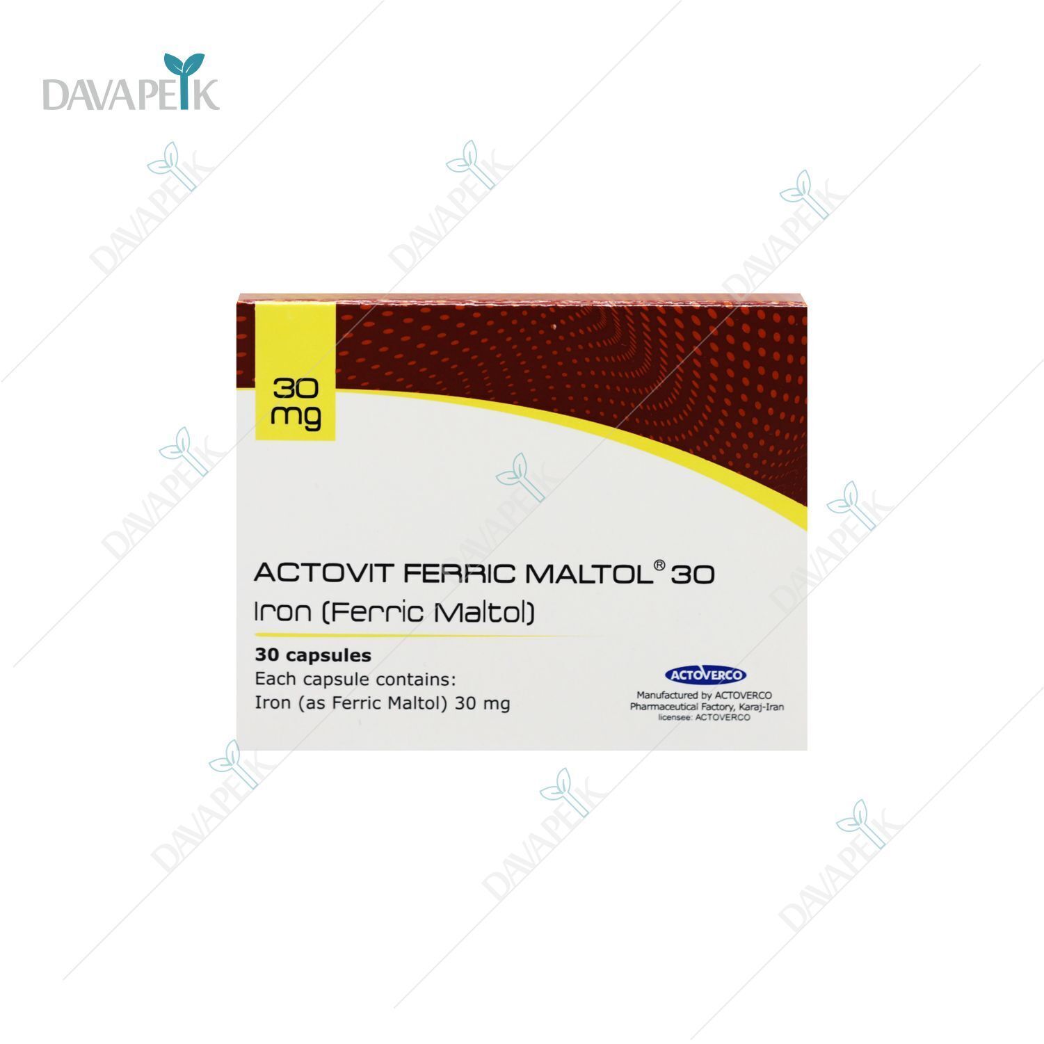 - Actoverco Actovit Ferric Maltol حاوی 30 میلیگرم آهن به فرم فریک مالتون است که جذب بالایی در بدن دارد .