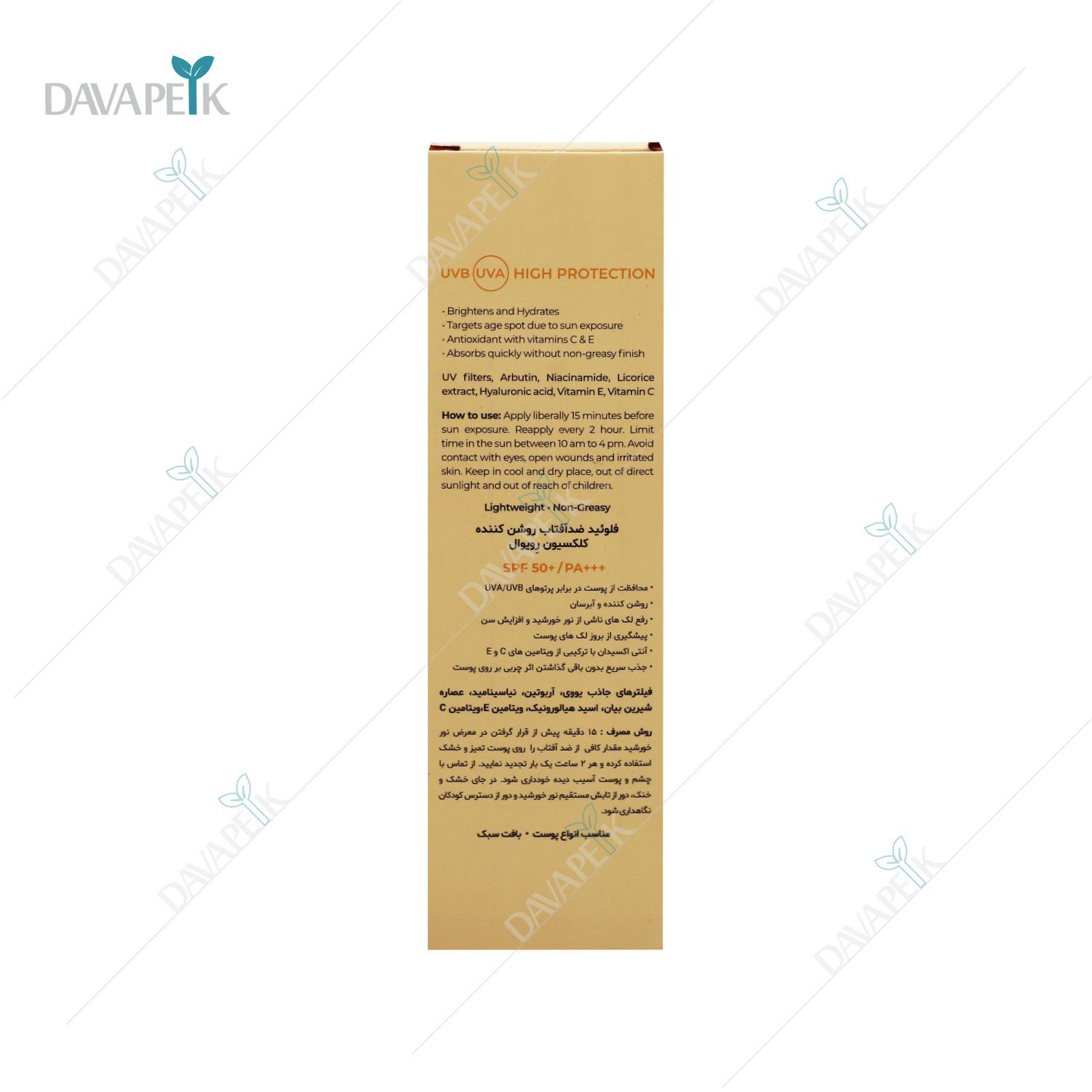 - ضدآفتاب فلوئید رویوال روشن کننده با بافت سبک و زودجذب، علاوه بر محافظت کامل در برابر اشعههای UVA و UVB، به کاهش لکهای پوستی و شفافیت بیشتر پوست کمک میکند .