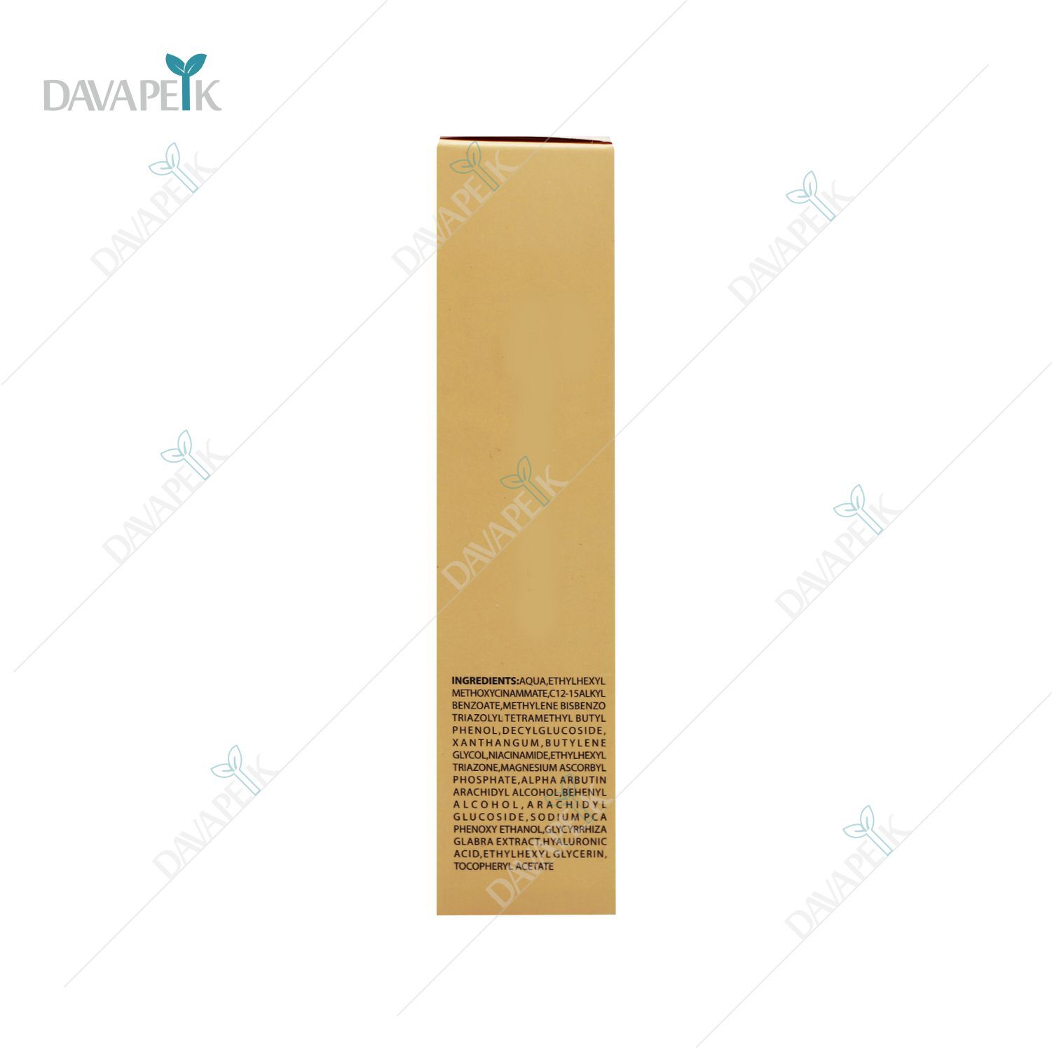 - ضدآفتاب فلوئید رویوال حاوی آربوتین ، نیاسینامید ، عصاره شیرین بیان ، هیالورونیک اسید ، ویتامین E ، C و .. بوده و کمک به کاهش لکهای پوستی و جلوگیری از ایجاد لک جدید می کند.