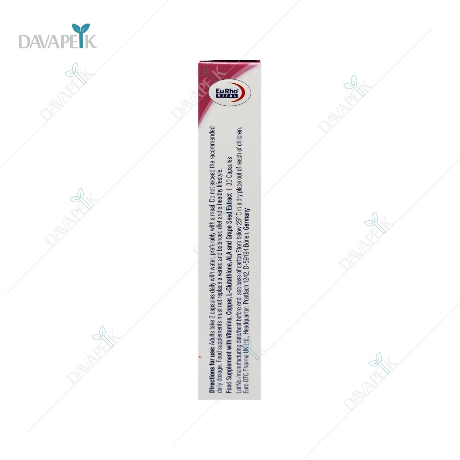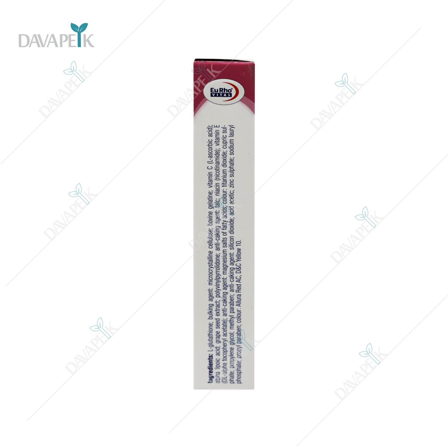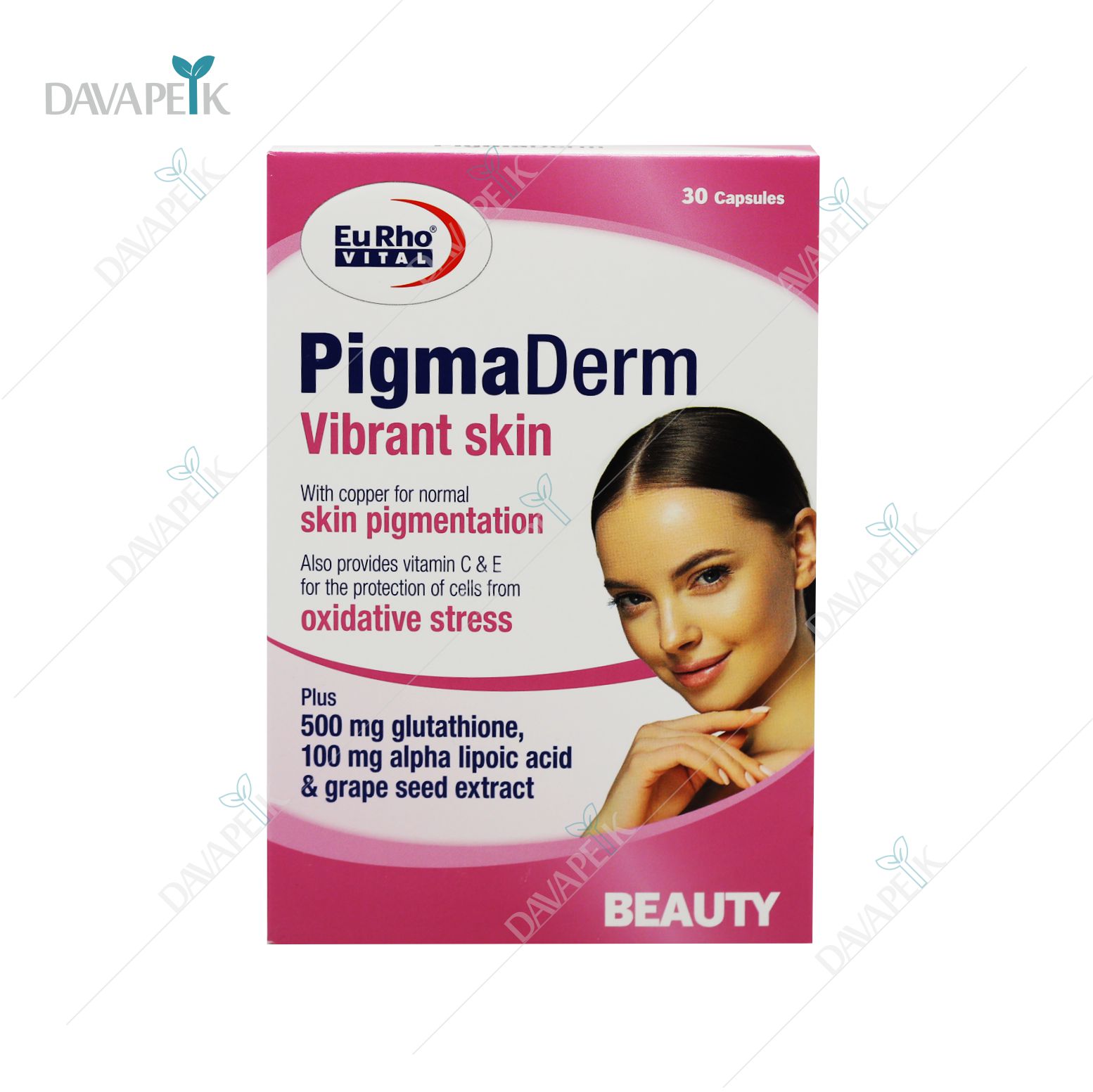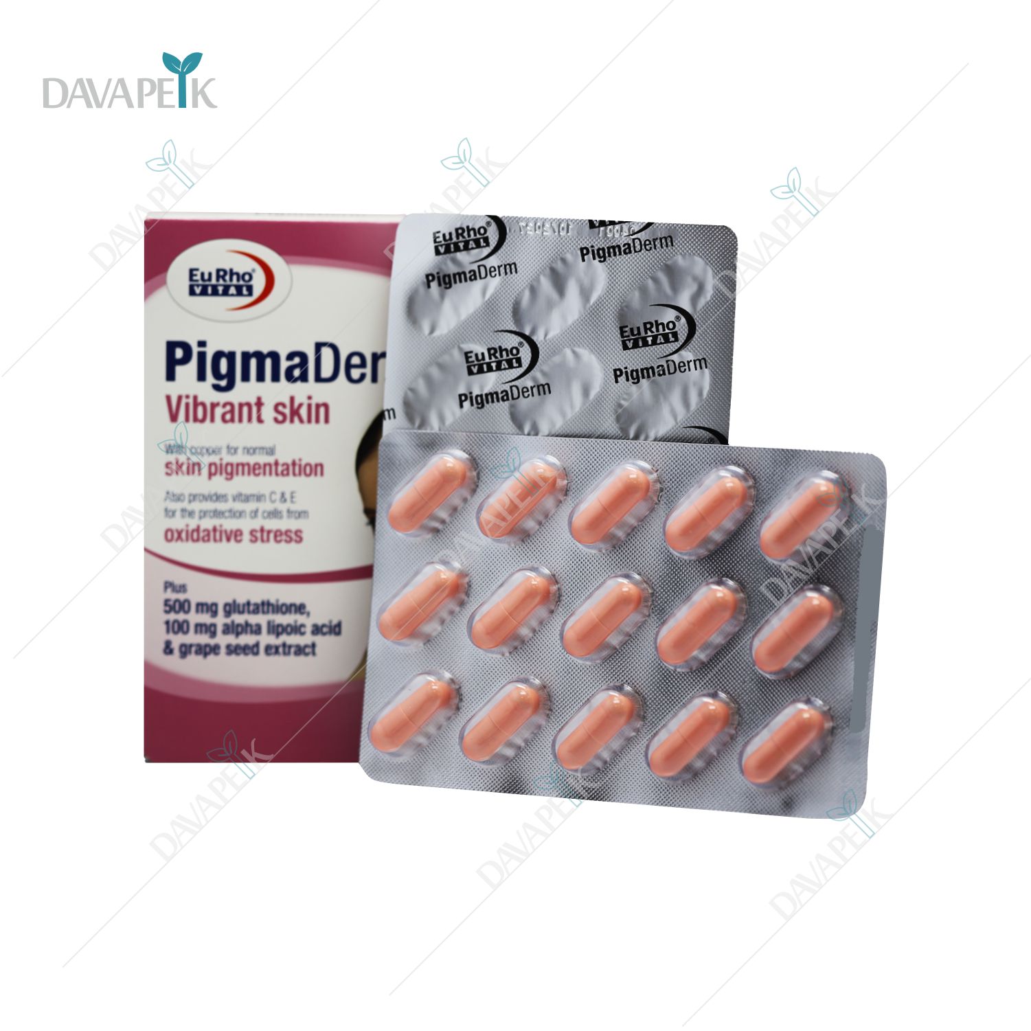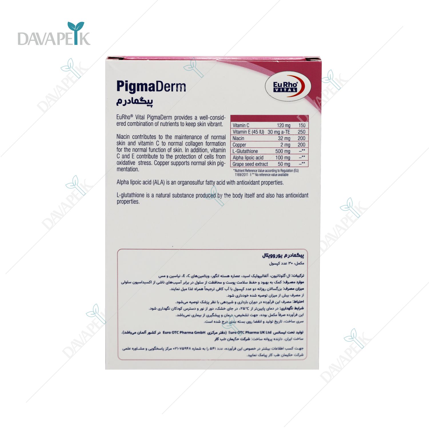 - Eurho Vital Pigmaderm Capsules ترکیبی از ویتامین C، ویتامین E، زینک، مس، نیاسین و عصاره انگور بوده که با خاصیت آنتیاکسیدانی قوی، به کاهش لکهای پوستی، جلوگیری از تیرگی ناشی از نور خورشید و افزایش درخشندگی پوست کمک میکند.