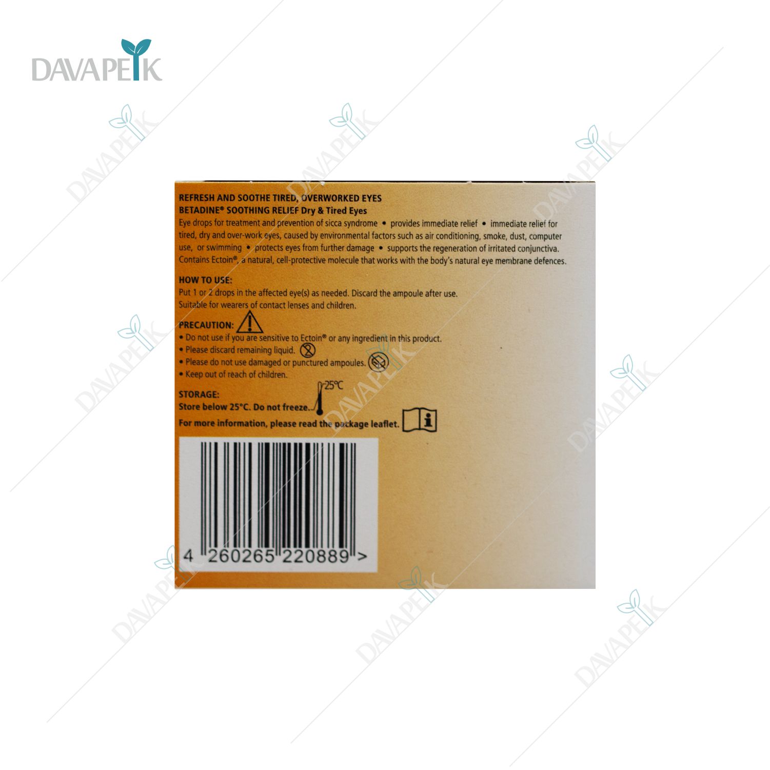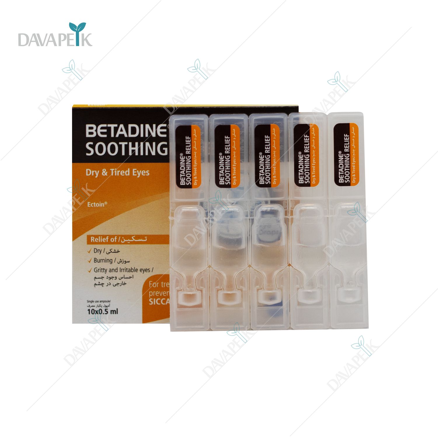 - Betadine Soothing Relief Single Dose Dry And Tired Eyes Drop باعث کم تر شدن تحریک ناشی از کار با موبایل و کامپیوتر، آلودگی هوا، لنزهای تماسی و حساسیتهای محیطی استفاده میشود.