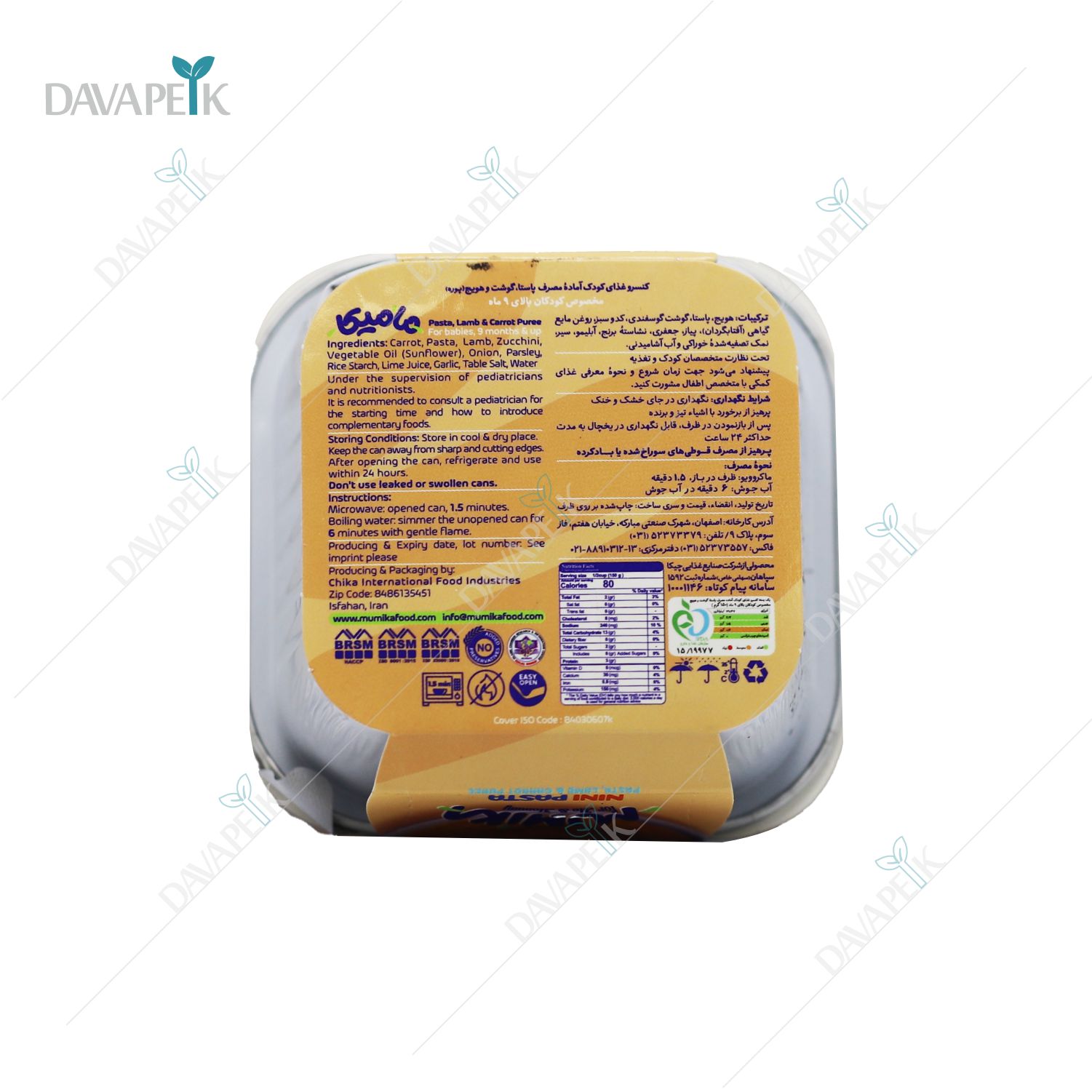 - مامیکا غذای کودک پاستا و گوشت و هویج ترکیبی سالم است که برای کودکان بالای 9 ماه تهیه شده و بافت نرم، هضم آسان و ارزش غذایی مناسب دارد.