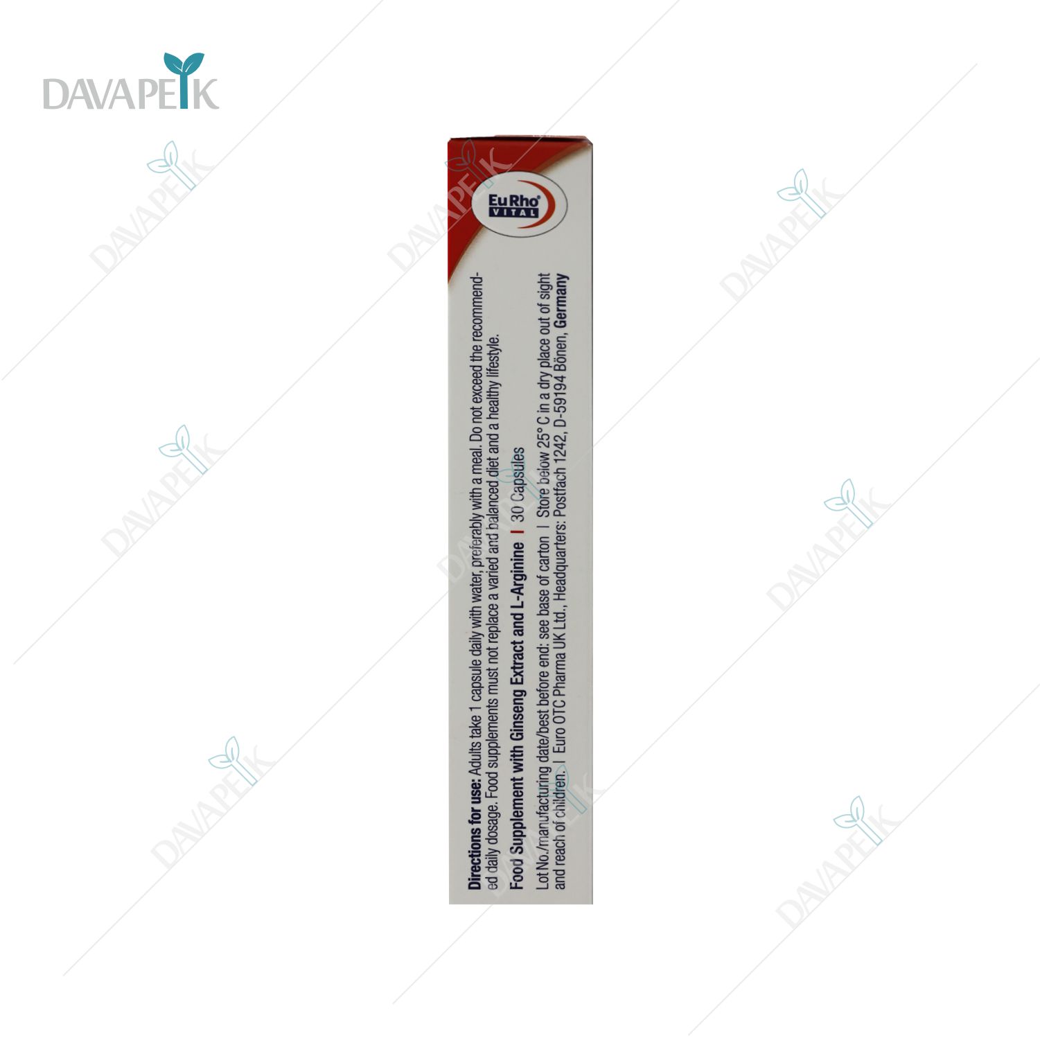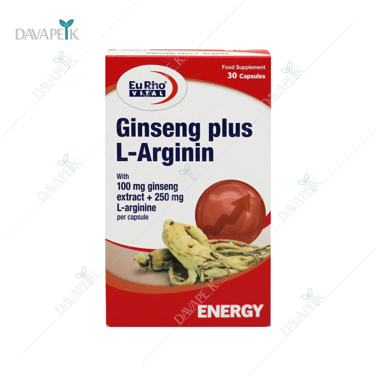 - Eurho Vital Ginseng Plus L Arginin Capsules مناسب برای برای افزایش انرژی ، کاهش خستگی و بهبود عملکرد جسمی و ذهنی است .