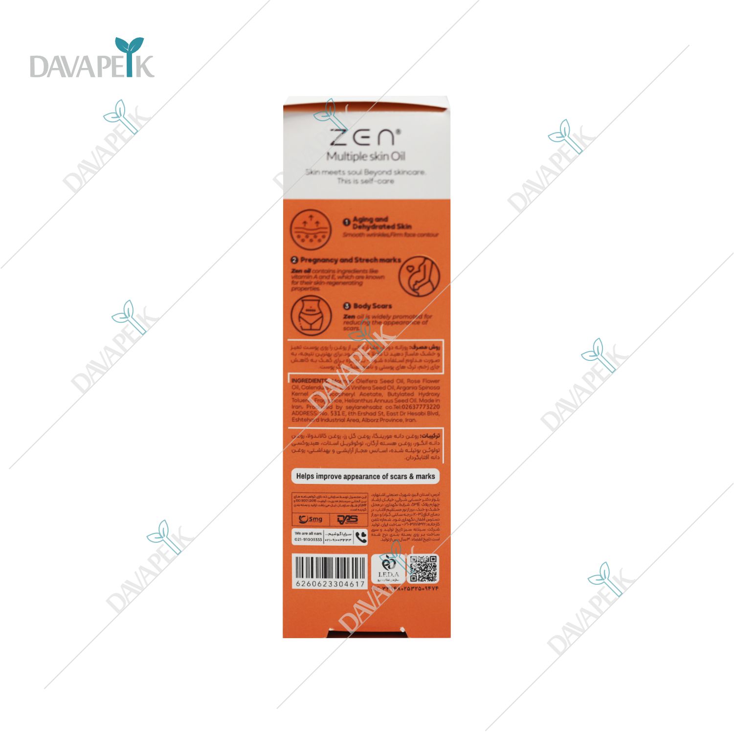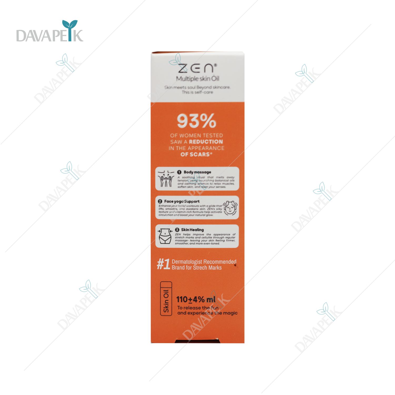 - Zen Skin Oil با فرمول مغذی و ویتامین E باعث آبرسانی عمیق شده و کمک به بهبود جای زخم ، ترک پوستی و لک و تیرگی می کند.