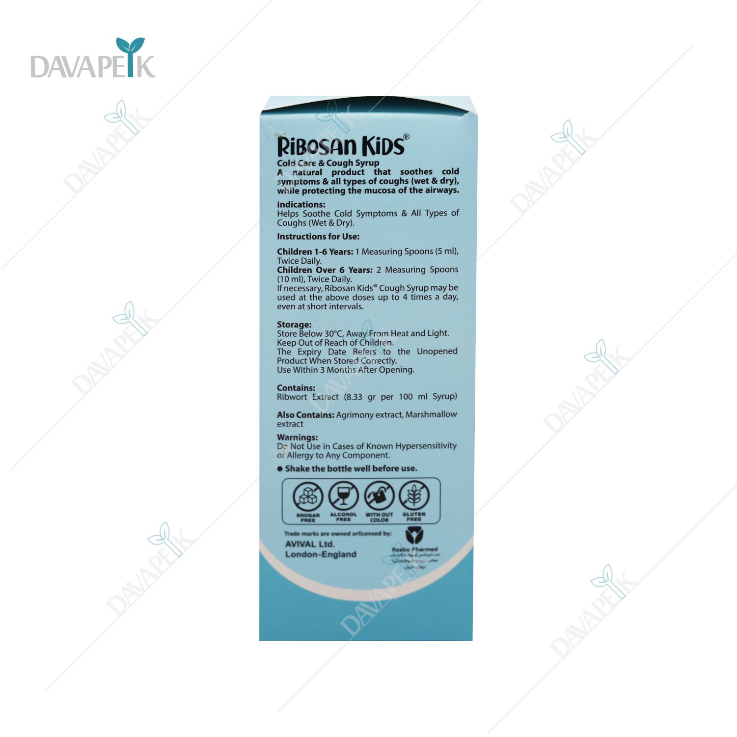 - Avival Ribosan Cold And Cough Kids Syrup با اثر تسکین دهنده خود به آرام سازی گلو و کاهش دفعات و شدت سرفه هم خشک و هم خلط دار کمک می کند و مصرف آن در دوره بیماری می تواند احساس راحتی بیشتری ایجاد کند.