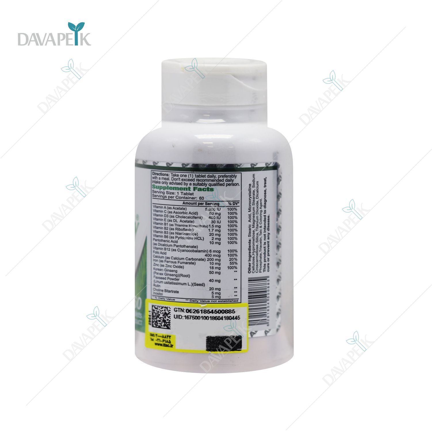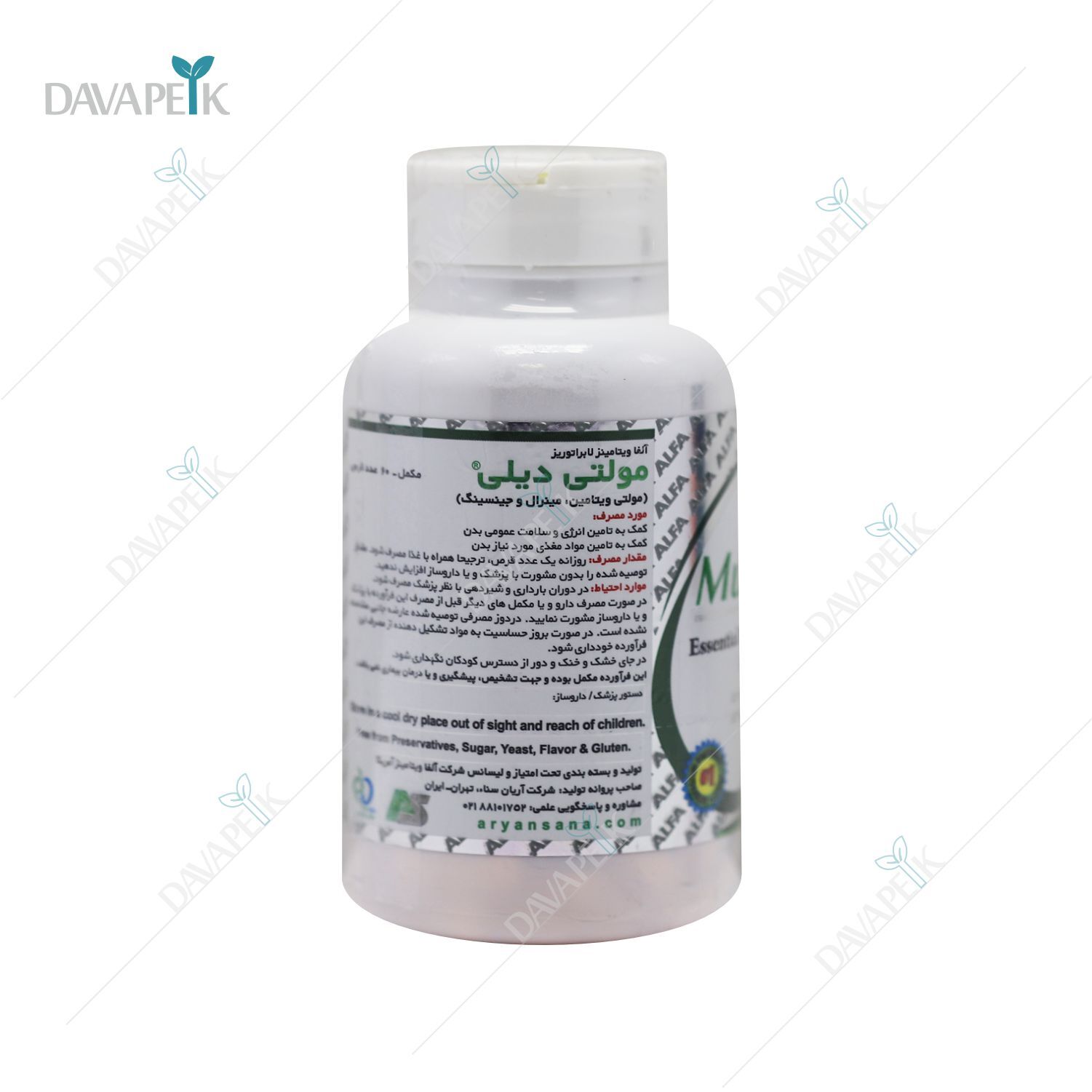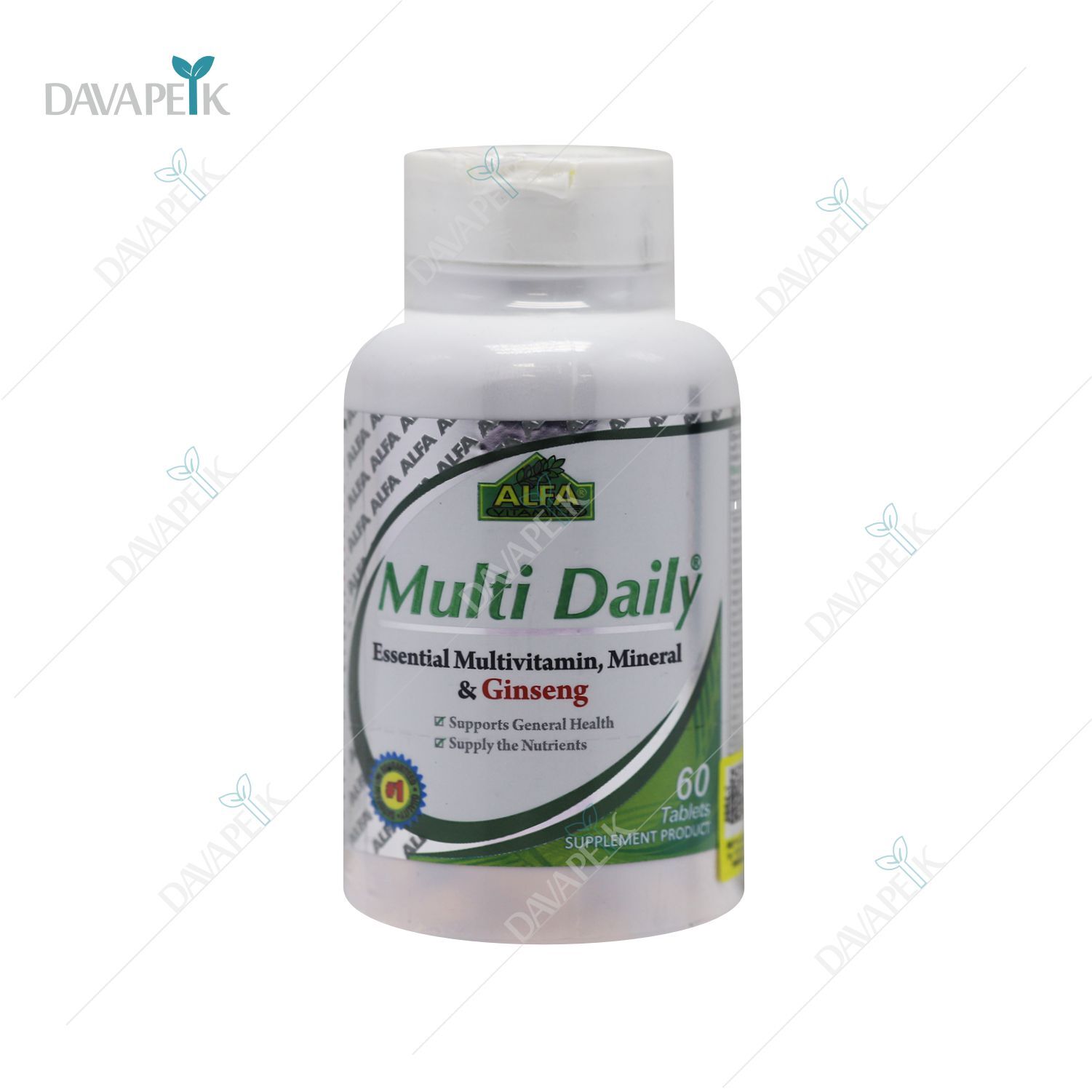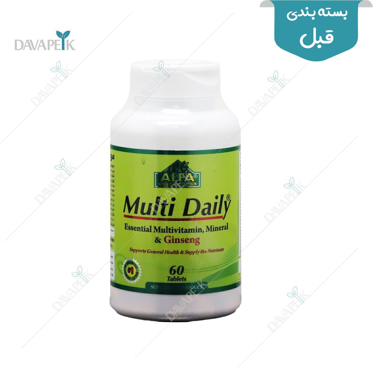 - قرص مولتی دیلی آلفا ویتامینز، مکمل کامل روزانه حاوی انواع ویتامینها و مواد معدنی برای تقویت انرژی، ایمنی، سلامت پوست، مو و ناخن و بهبود عملکرد عمومی بدن.